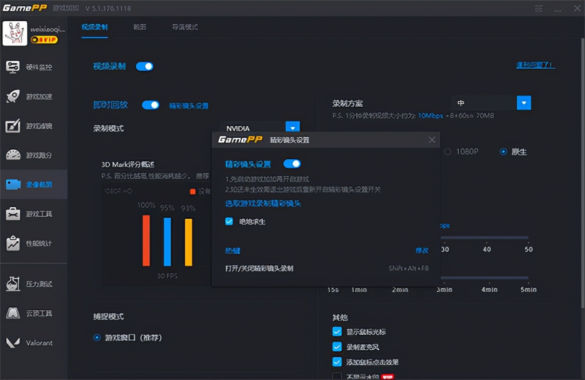 即时回放模式保存录制视频之前时间段的视频回溯模式就是在你发生精彩镜头后,按下快捷键,系统会保留你按下快捷键之前时间的这段视频。录像性能模式也有三种供玩家选择AMD Relive、Nvidia Shadowplay和兼容模式,除了三种录像模式外,玩家还可以在界面右侧设置视频的录制参数,值得一提的是,AMD显卡的玩家可以选择AMD Relive精彩一刻选项,可以获得更少的性能消耗。