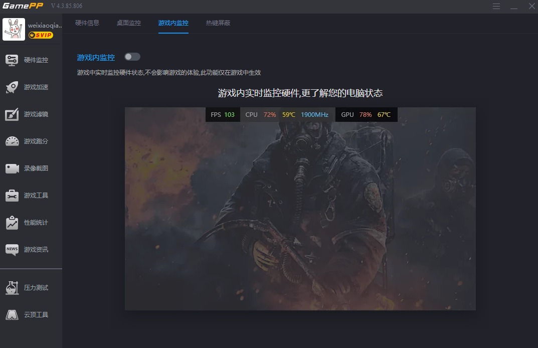 4、接下来,切换至游戏加加的游戏内监控的设置页,将游戏内监控开启。