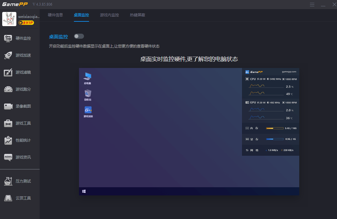 2、然后,用户切换至“桌面监控”设置页,开启桌面监控。
