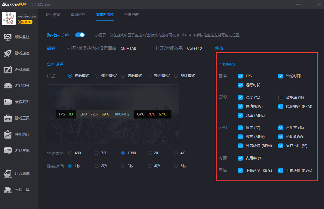游戏加加在游戏中显示帧数,需要打开游戏内监控,这样,帧数才会真正显示出来。