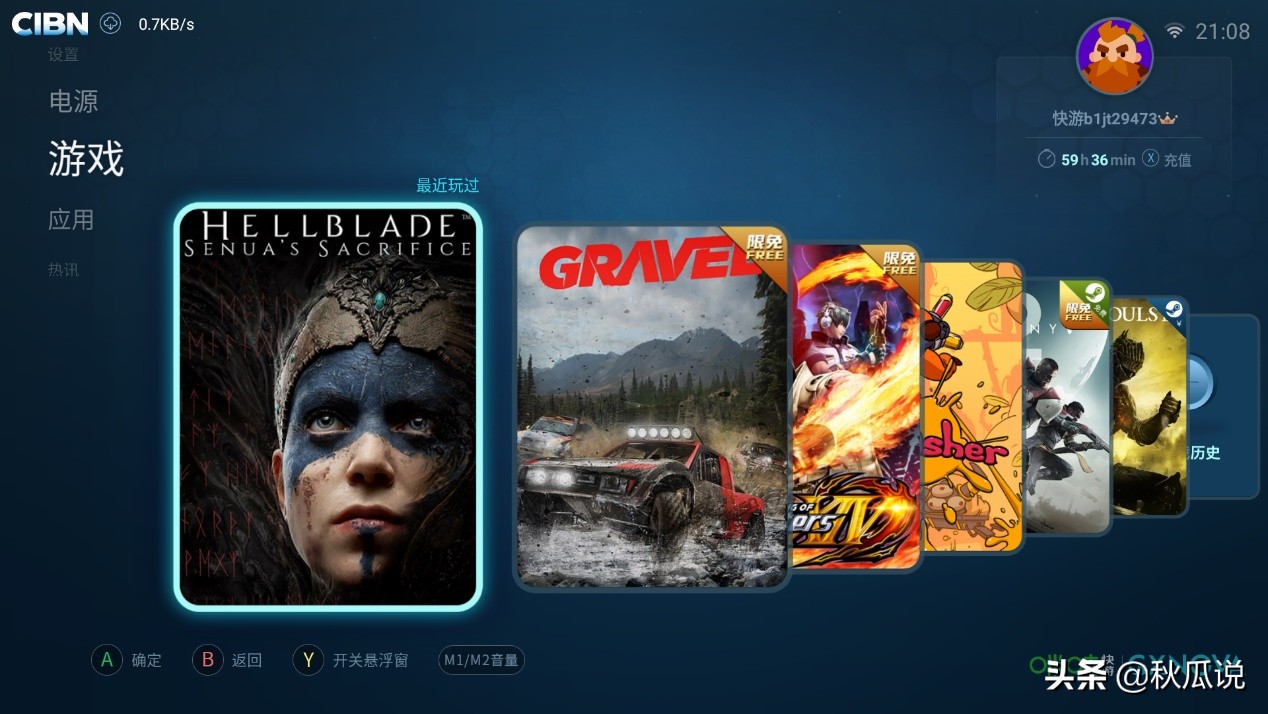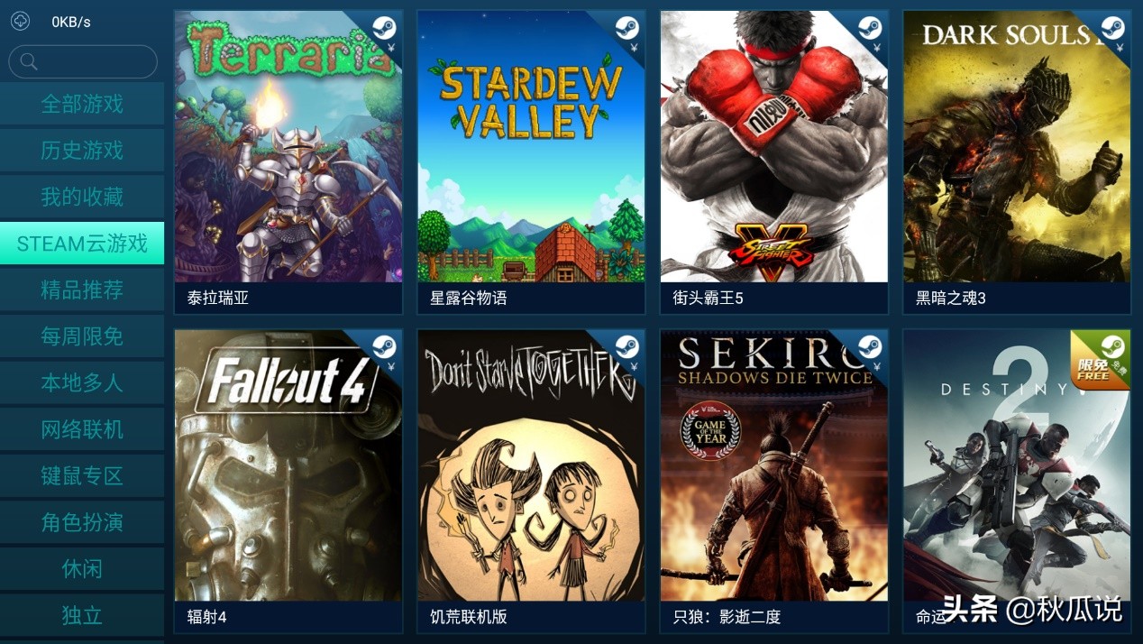 游戏内容方面,主要内容来自"steam"游戏,里面内容需要登入用户自己的"steam"账号购买相应的游戏才可以玩。这里可以理解成在"云网吧"玩游戏,算力都在咪咕的服务器中完成,编解码成视频流,通过网络传输到显示端。目前上线比较热门的steam游戏有《只狼》、《糖豆人》、《街霸》、《命运2》等,同时内置了版权有例如SNK的拳皇、《荒野飞车》等3A大作。