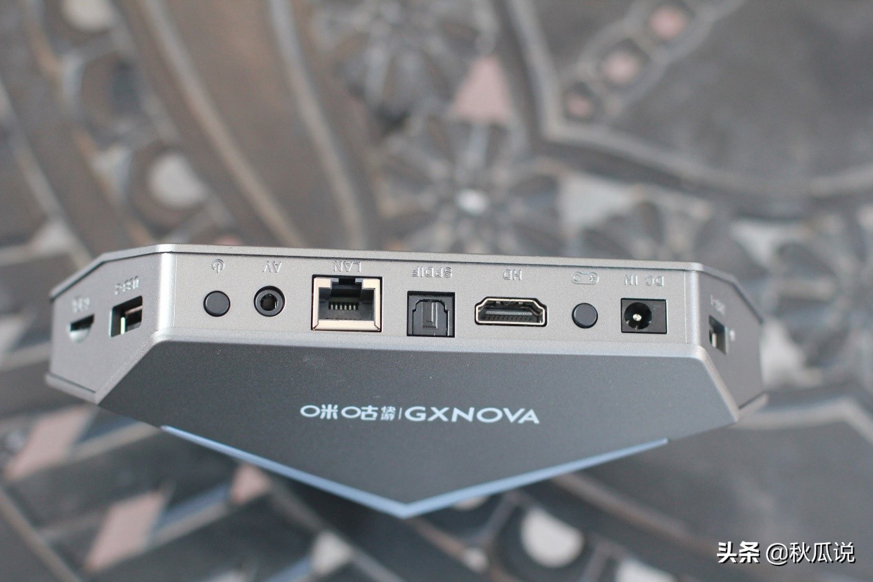 外观方面咪咕快游云游戏盒子采用的科幻三角造型设计,整体采用深空灰色系,搭配彩色的呼吸灯,彰显出炫酷的游戏风格。体积方面和小米盒子大小相当,在盒子正面印有"咪咕GXNOVN"字样。盒子顶部则带有一个显示时间的液晶显示屏,整体一下子显得比较精致。