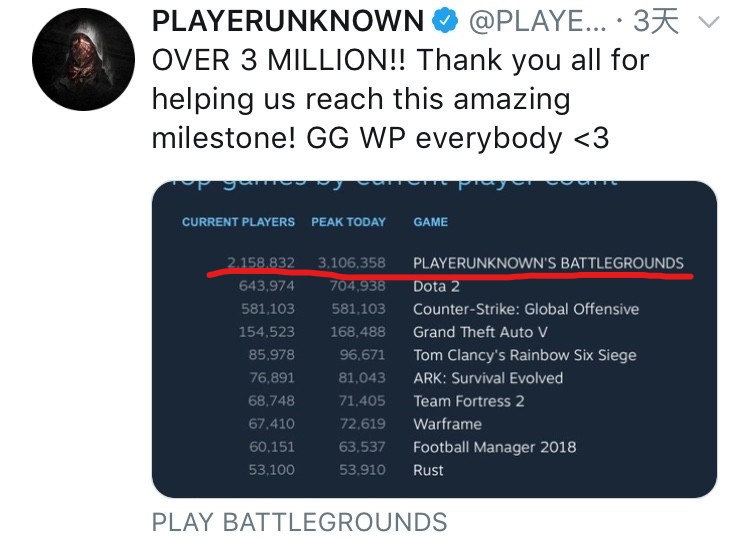 绝地求生官方在某社交平台发布的steam截图,第一名为绝地求生,当日最高在线人数达3106358