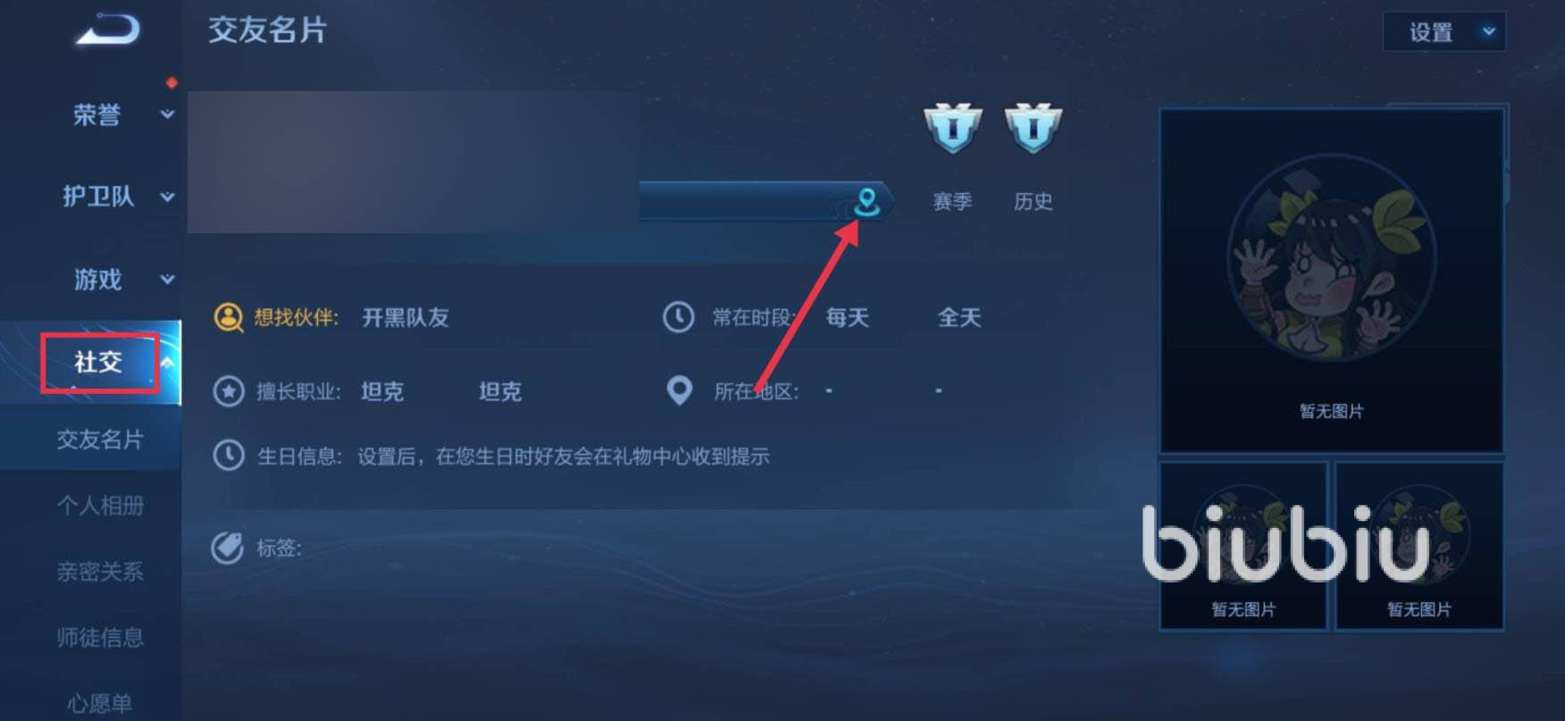 1、首先自然是进入游戏,点击自己的头像,来到个人主页,再点左侧菜单栏里的“社交”,跳转到社交页面,就能看到自己的荣耀战区信息;