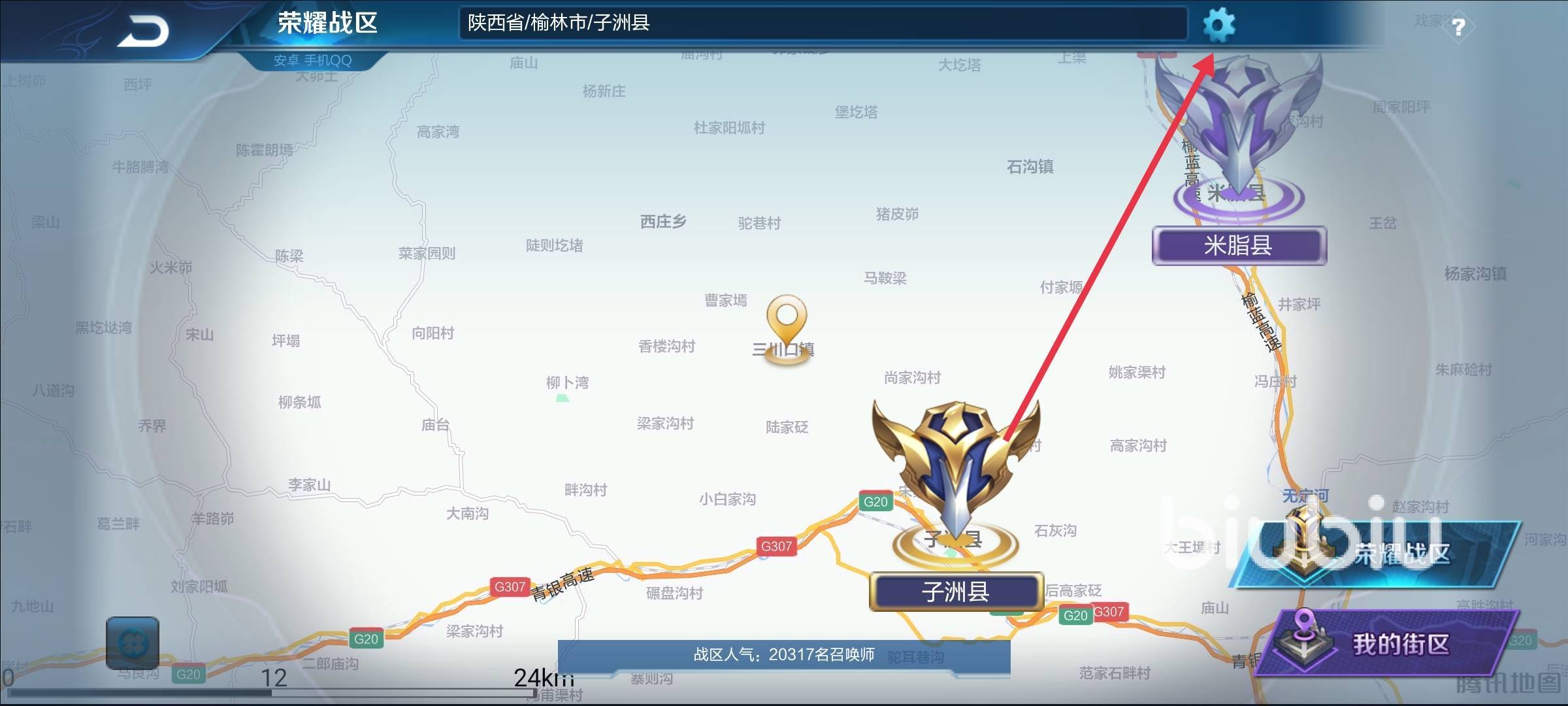 2、再点一下荣耀战区后面的定位小图标,就来到战区页面,在屏幕上方能够看到一个小齿轮的图标,点击这个齿轮图标,就能够对位置地址进行更换了。