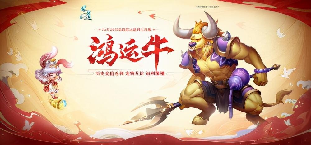 牛年喜事多,鸿运当头来,《问道》双线联运返利生肖服“鸿运牛”它来啦,10月29日12点正式登场!“鸿运牛”系列全新生肖宠物闪亮登场,宠物升阶玩法趣味多多。还有超强返利活动历史充值大返利开启,充值即返50%,机会不容错过哟!