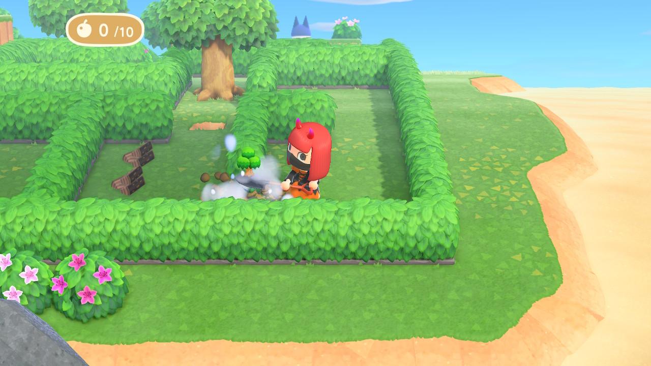 进入迷宫后,捡起铲子,先将右侧的花丛铲起,获得里边的水果,随后吃掉将正面的树挖掉。