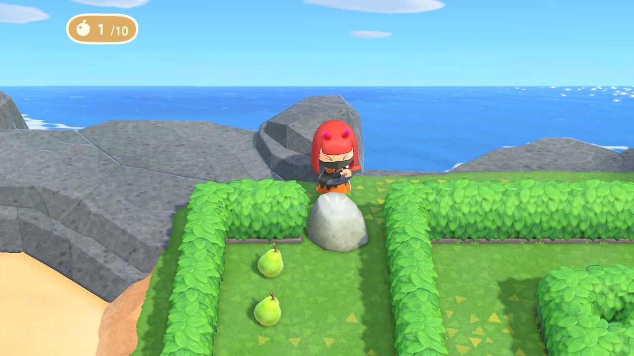 吃掉全部水果,将前边的石头击碎,围着高台旁的水池绕一圈再将拦路的树挖掉。铲平树的坑后,向下走,捡起下边的两个水果。