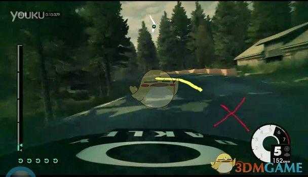 此弯多次尝试5挡转速不怎么会降低,这里有点坡度,偏力大,4挡过更快~~ 5挡过的方法如前面第一个发夹弯, 切内弯,吃抓地。左前轮陷入红叉处, 键盘党就算了,绝对更慢,盘子党可以考虑,没试过~~~