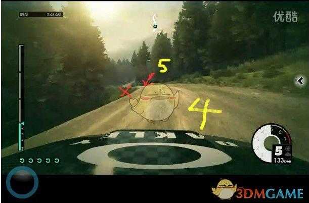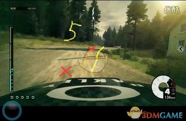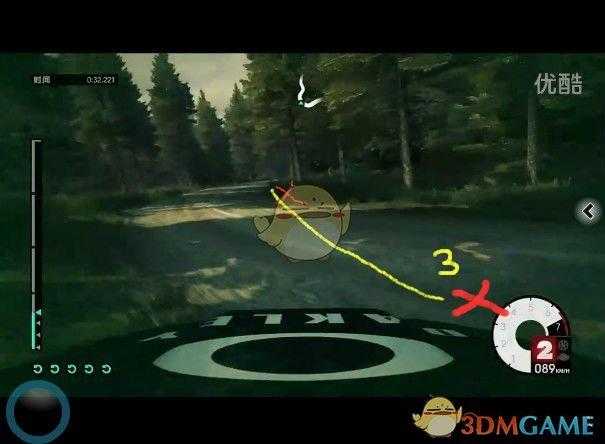 此弯3挡, 第一个红叉是指正图上的车头位置,这位明显刹车过慢,第2个红叉切点,右前轮陷草堆,为什么切这么狠,因为键盘,按住不放, 让车身有偏外弯侧位移距离更长,不至于偏出赛道撞树~ 为啥不松一下油门, 窄角度弯,你敢松引擎转速马上狠狠的往下掉~ 这就是键盘的硬伤