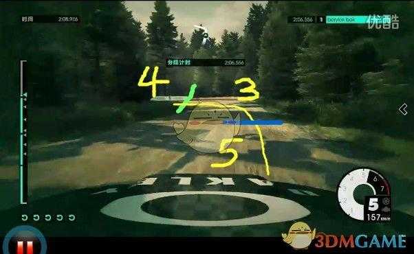 这图前面忘记怎么的了,估计是直路吧。反正蓝线处刹车点,5降3~~ 看黄线,绿线处切(画得不太准差不多了)~ 出弯4挡~~还是那句 慢进快出~~ 怎么不试试4挡滑过去啊? 还是油门刹车的问题~~ 所以玩拉力还是入个盘子好