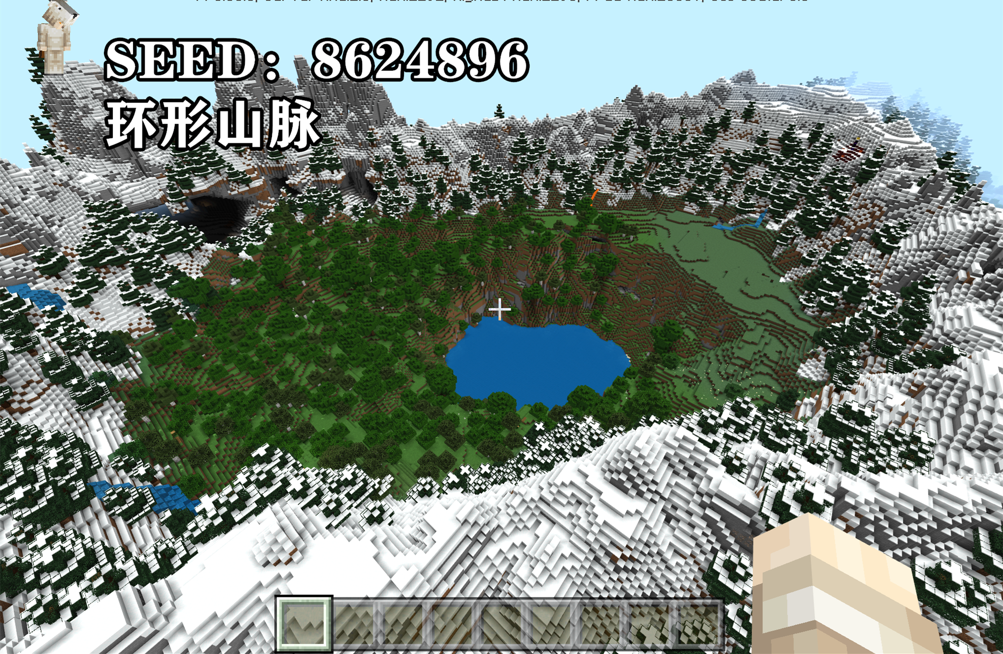 众所周知,Minecraft 1.18的版本主题叫作“洞穴与山崖”,其中山崖的部分就是对山地群系大刀阔斧的改革。而这个种子最值得你去探索的便是这座天然形成的环形山脉,整座环形雪山的中间覆盖着茂密的树木,山谷的最中间是一片水潭。