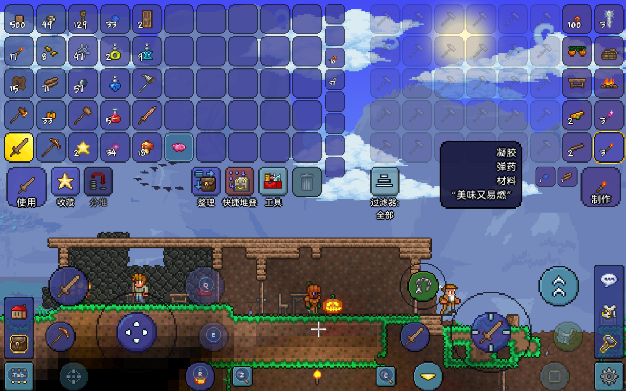 照明工具:在深入地下之前,可以先对道具做一下准备,首先火把是必备的,材料是打史莱姆掉落的凝胶与砍树获得的木材,建议至少先准备个几十把。