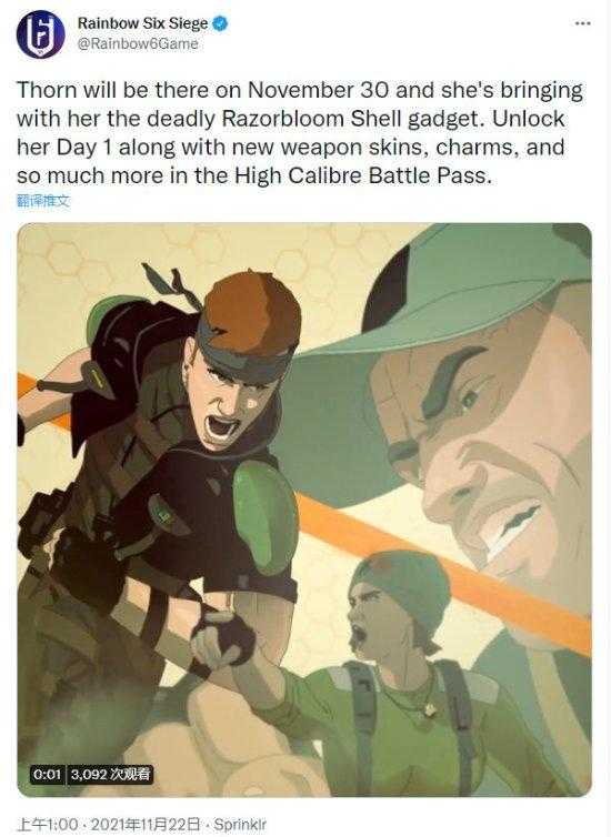 今日(11月22日),《彩虹六号:围攻》官推宣布“精兵锐器行动”将于11月30日上线正式服,准备好迎接Thorn的加入和她的剃刀花榴弹吧!