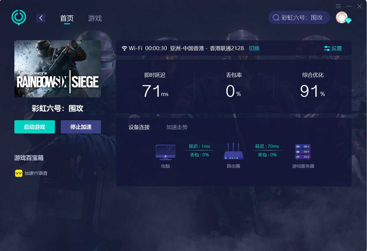 第二步:使用加速器,同时加速Uplay、steam平台和彩虹六号:围攻,记得要选好想加入的区服哦~