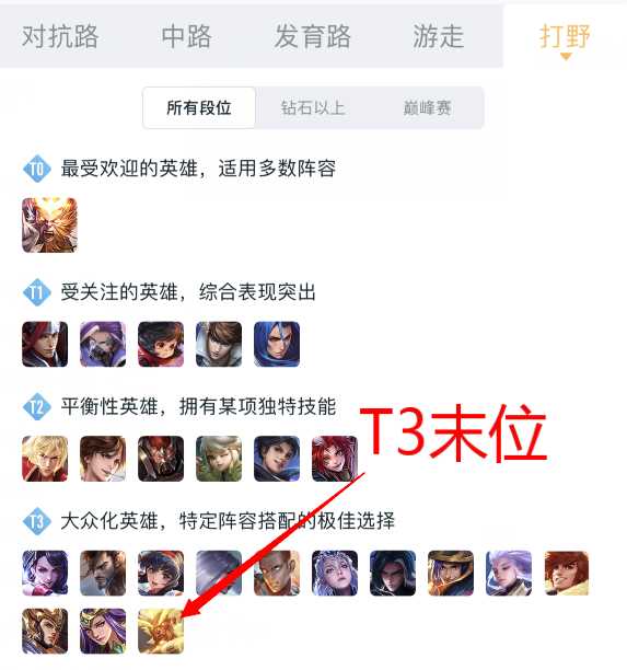 然而在路人局中盘古却是一名非常冷门的英雄,无论是巅峰赛顶端局或是排位赛中,盘古的出场率都极低,如下图所示:盘古在所有段位热度排行榜中位列T3末位。