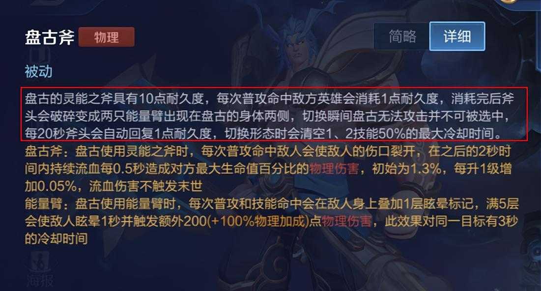 盘古的初始形态为盘古斧形态,盘古斧拥有10点耐久度,每次普攻敌方英雄都会消耗1点耐久度,当消耗完后斧头的10点耐久度后即会变身为能量臂形态。