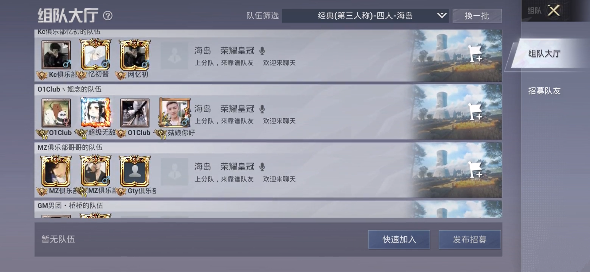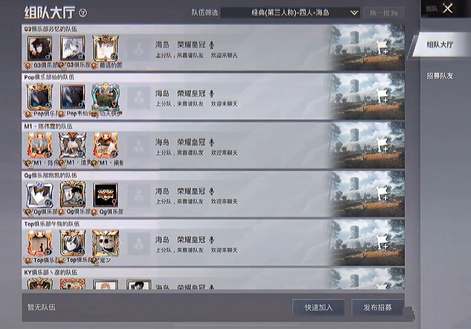 但由于没有大平台依靠,这些俱乐部一般都是靠各类社交平台、短视频平台来招揽“老板”,和平精英自带的“组队大厅”,也就成了他们的渠道之一。