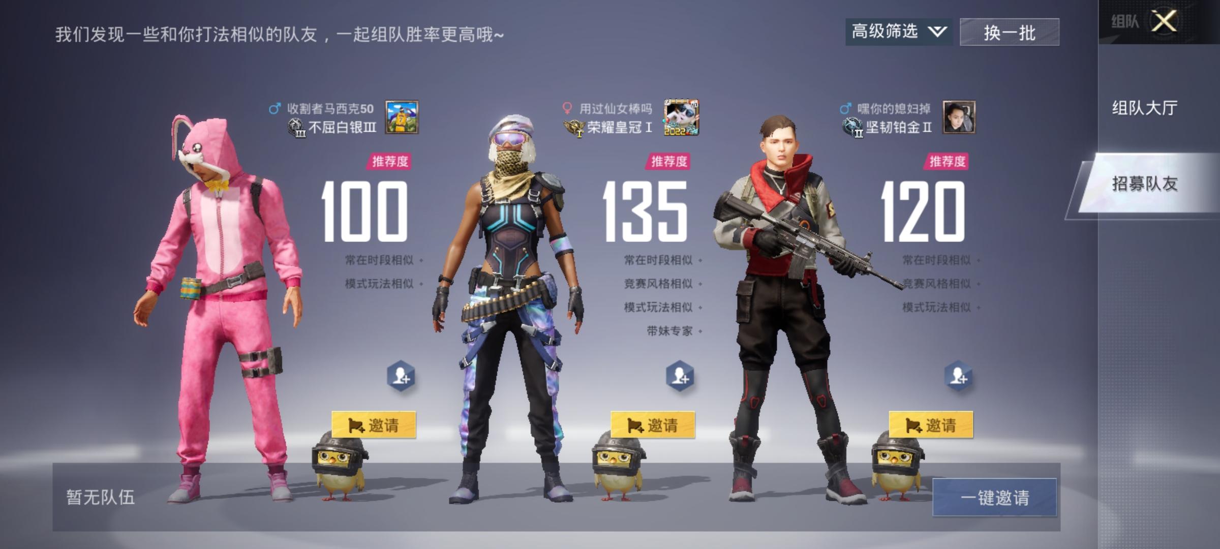 事实上,这样的房间在高段位简直是太常见了,以至于正常招募队友的房间都已经见不到几个,严重影响了普通玩家寻找合适队友的体验。