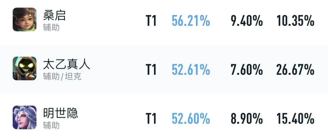 这两位英雄的巅峰赛数据都比较出众,桑启的胜率甚至有56.21%,属于独居一档的存在,要知道这还是在接近10%出场率的前提下。