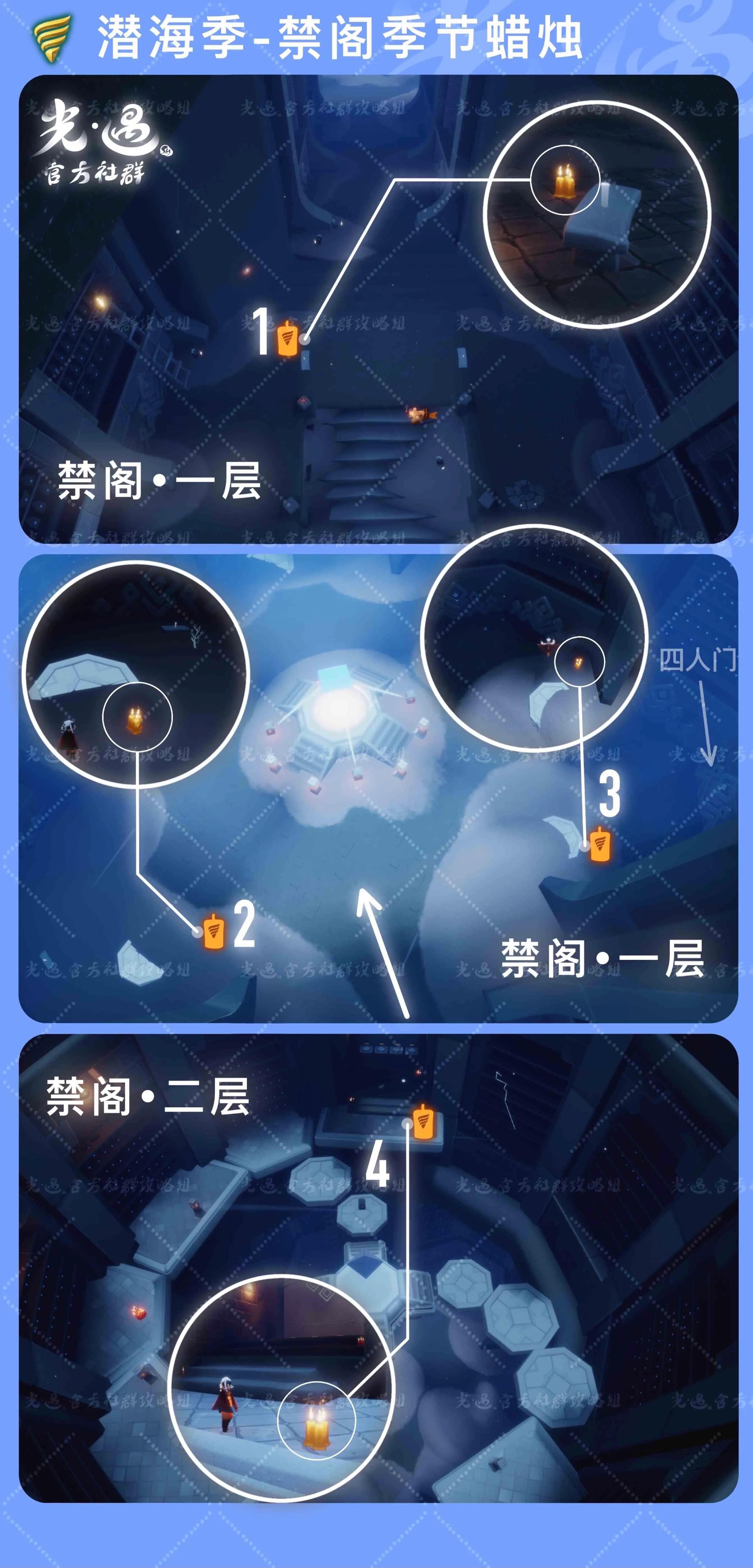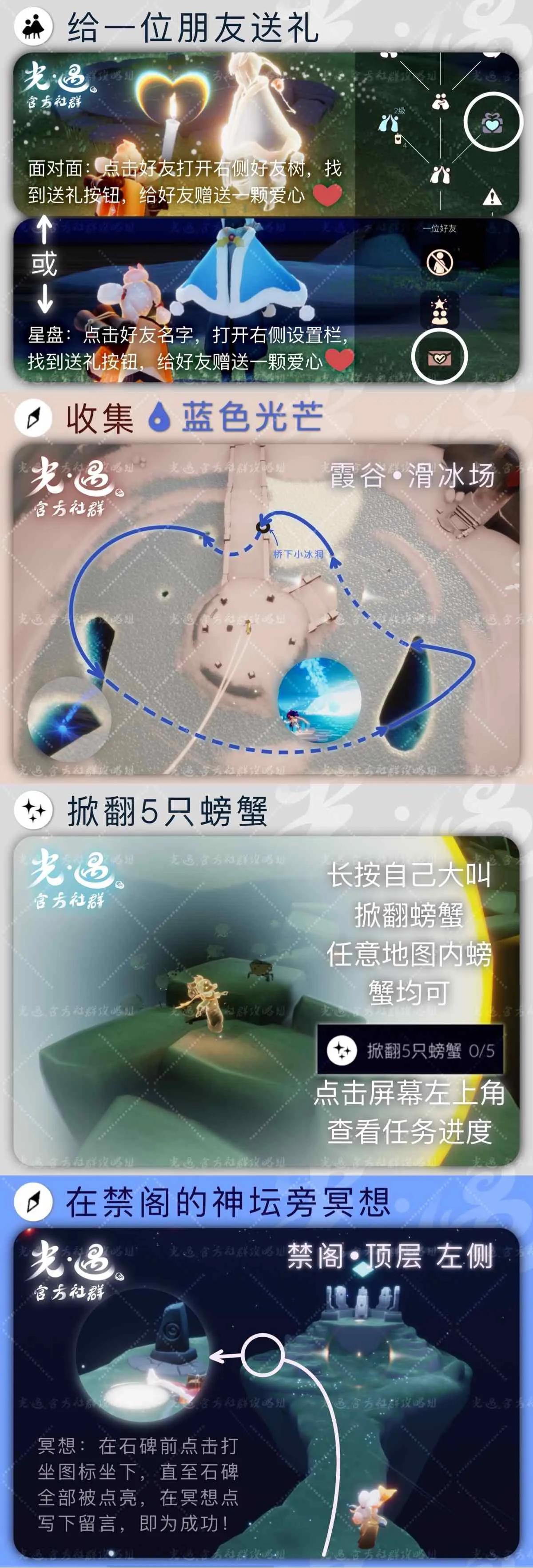 ❣️今日任务图解〔①给一位朋友送礼〕〔②收集蓝色光芒〕〔③ 掀翻5只螃蟹〕〔④在禁阁的神坛旁冥想〕禁阁顶层