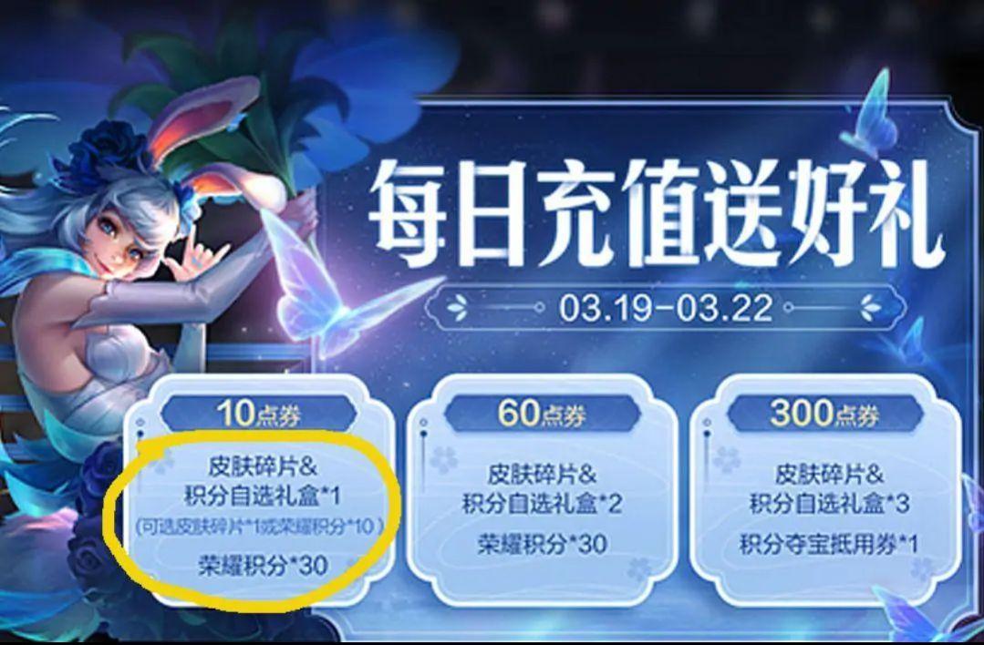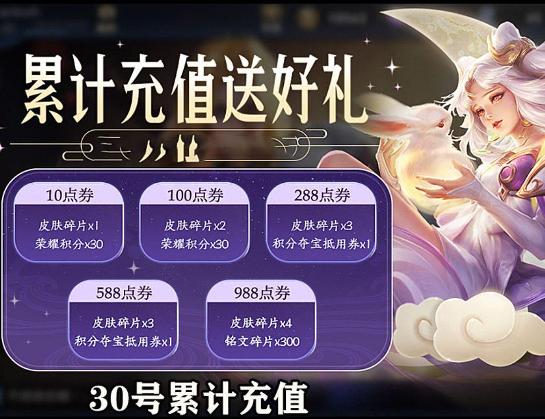 接下来我讲的都是理论上的知识,但是这些理论如果时间足够长,确实是可以实现的。我们能够发现现在的每日充值活动其实是改版了的,我们充值一块钱可以获得10点券和40荣耀积分,放弃1皮肤碎片。如果这样的话,相当于我们充值一块钱就可以兑换为50荣耀积分如果我们拿着50荣耀积分去夺宝的话,可能只能购得宝一次,甚至一次都不能够夺宝,那么我们就要在利用夺宝打折的时候,所以我们平时每日充值活动的积分先攒着,先不要用。