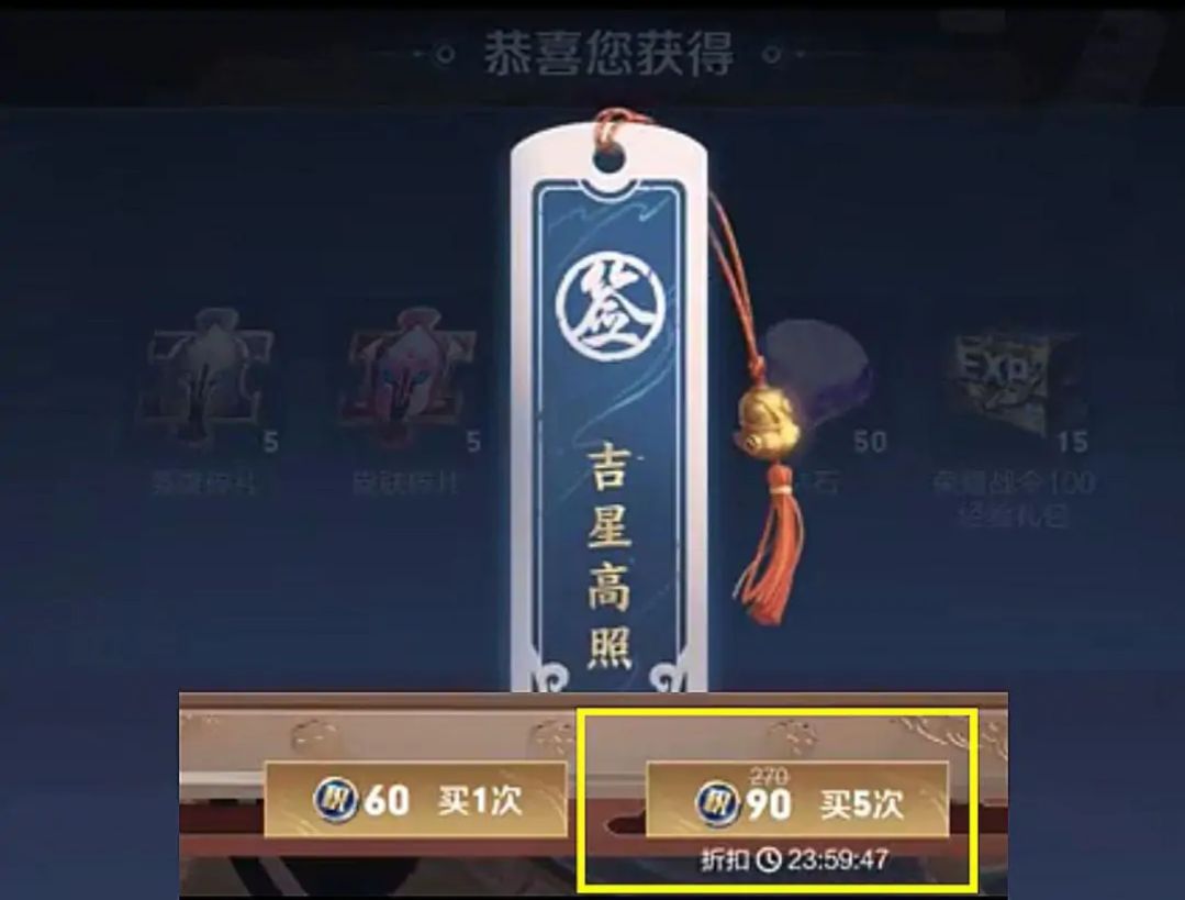 如果四块钱可以来自五连抽,相当于我们两百多块钱就可以必得荣耀水晶。当然这只是理论上的,我们平时在积分夺宝的时候还会有吉星高照,也就是享受折上折,一旦折上折,出现我们90荣耀积分就可以购买五次积分夺宝。