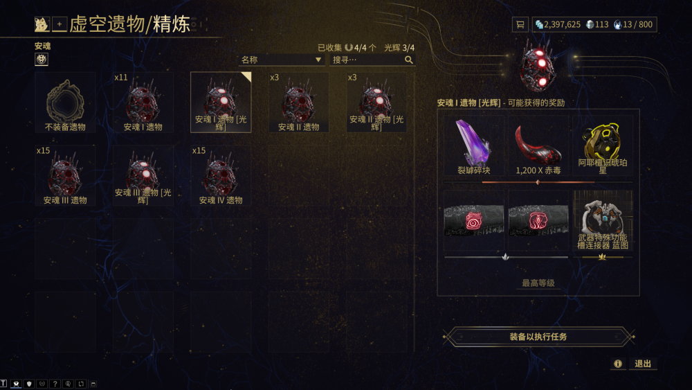 然后选择你想获得的安魂Mod对应的安魂遗物即可。OULL则特殊一点,在你击败玄骸的时候会有一定几率掉落。