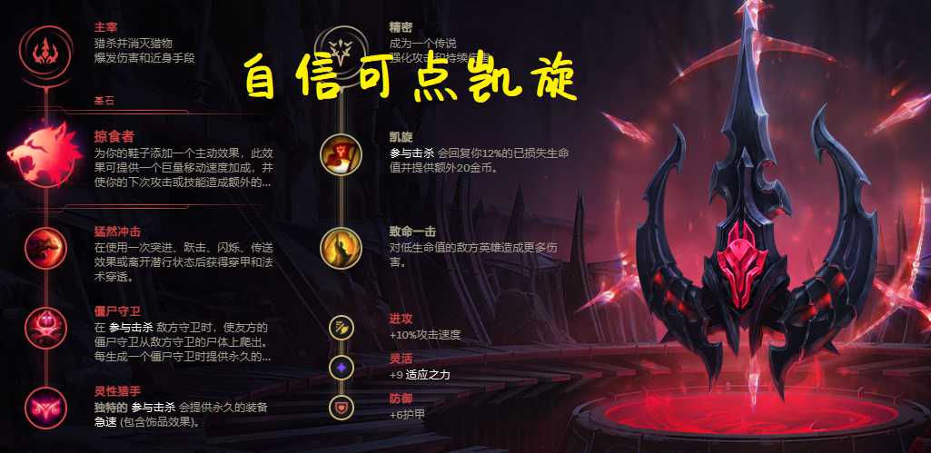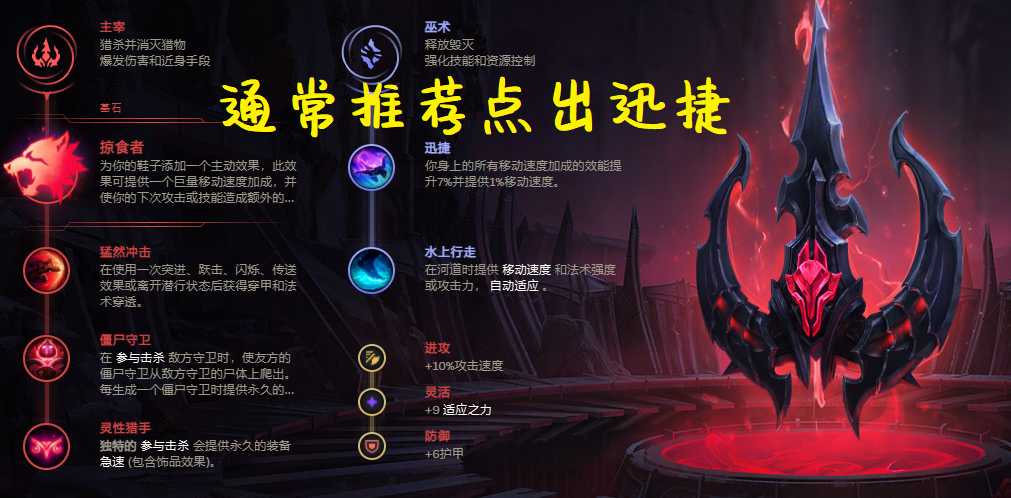 破败王即使走AP路线,也能造成百分比物理伤害,猛然冲击提供双穿性价比极高,眼球收集器则是提升滚雪球能力,比较注重视野的朋友也能换为僵尸守卫,灵性猎手则是经过加强之后变得十分强力,叠满后能够减少装备三分之一的冷却时间。迅捷则是提升佛耶戈在茫茫焦土以及开掠食者时的移速,让佛耶戈更快接近敌人,水上行走则是提升河道作战能力。至于凯旋与致命一击相信就不用多说了,团战收割最佳选择。