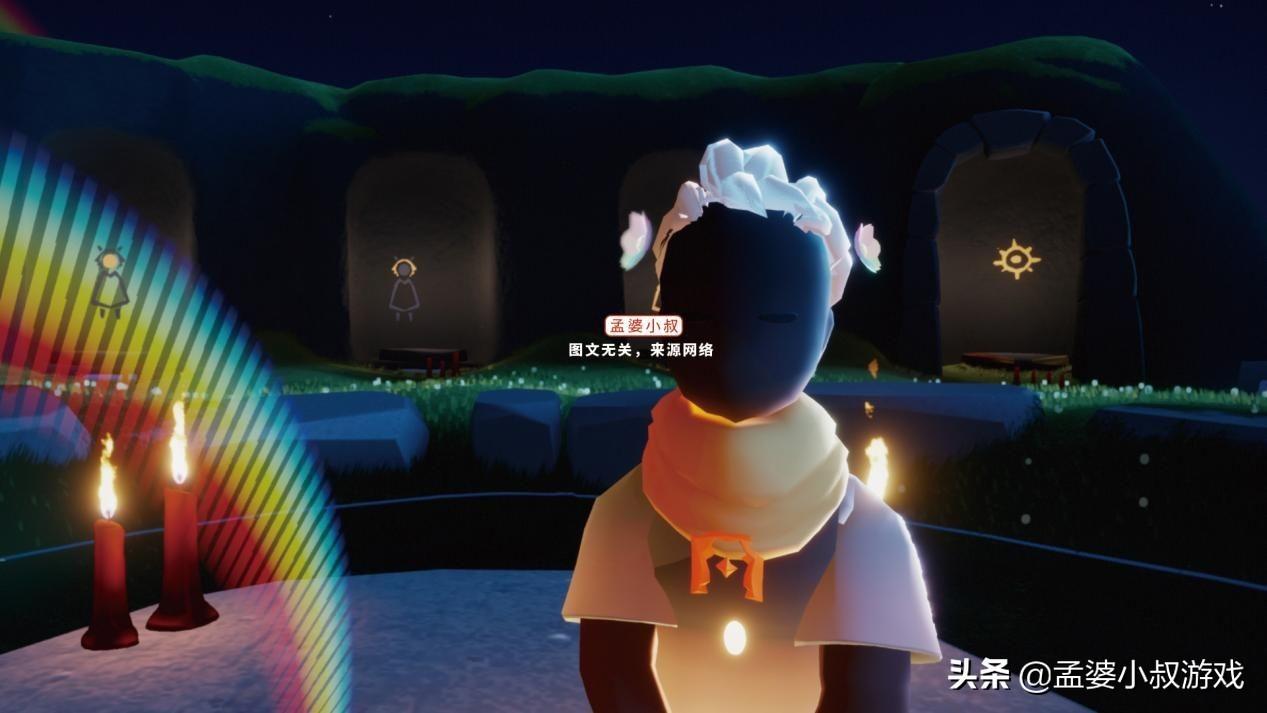 旧的不返场,肯定就有新的到来。确实是如此,彩虹花不返场,今年就上线彩虹双花。跟彩虹花相比,两者的区别在于彩虹花大,彩虹双花小;彩虹花是一朵,而彩虹双花是两朵,在光之子的头部两侧展示。大家可以这样理解,彩虹双花,就是缩小版的彩虹花,然后复制一朵,粘贴在另一边。