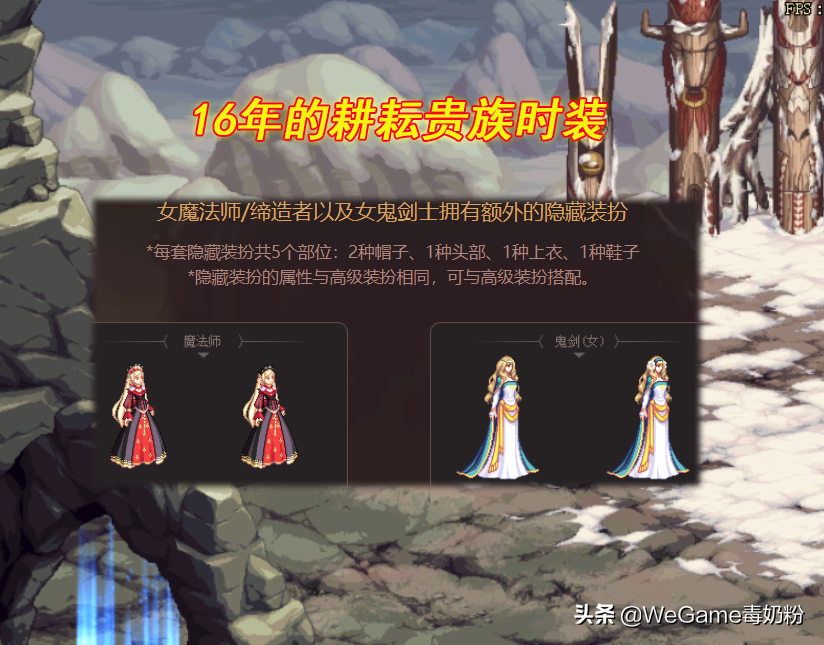 经过尝试,策划仿佛打开了新世界,于是在16年的五一套加入了“女魔法师”和“女鬼剑”的特殊贵族时装,获取方式也很独特,买1套送1个部位自选礼盒,4套凑齐全身时装,5套解锁2种帽子。可惜这外观一言难尽,但贵族套的称号是减CD的属性,比如“荣耀贵族”,目前拍卖行2E金币!