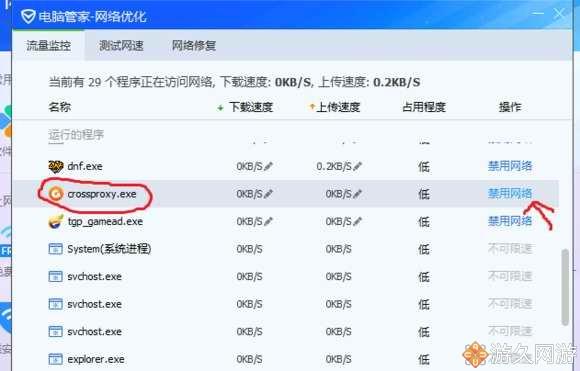打开流量监控后找到红色圈圈哪个程序点击禁用网络。大功告成,重启游戏,以后这些乱七八遭的东西再也不会出现,而且还不会影响TGP功能