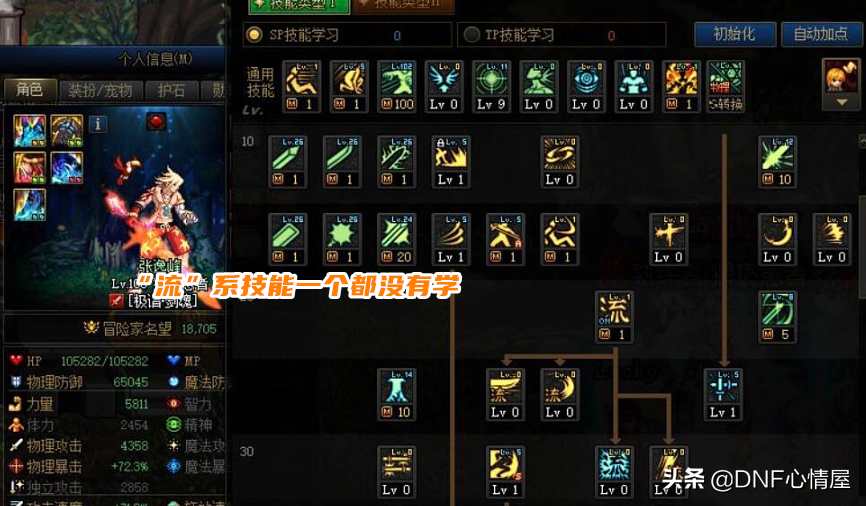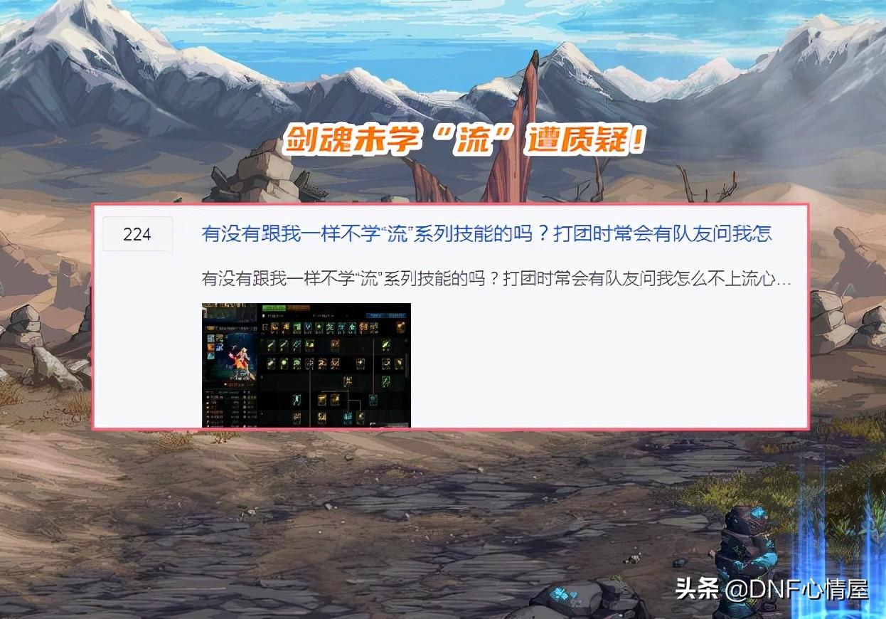 其实“流心”这个技能,不光增加“流”系技能伤害,也会有物理暴击率加成。对剑魂暴击率不足,“流心”技能必备,但存在着缺点!必须要占格子,这点就很烦,对不学“流”系剑魂最大优化。