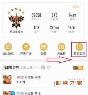 2、点击下方的【战绩】,再点击【更多工具】;