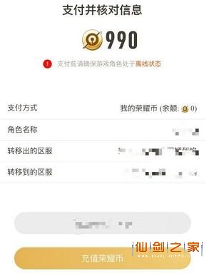 6、充值990荣耀币进行支付,角色处于离线状态即可从安卓转移至苹果。