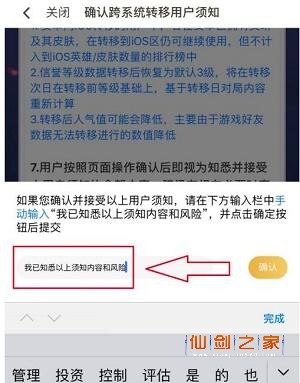 5、仔细阅读跨系统转移用户须知,在下方收动输入【我已知悉以上须知内容和风险】,点击确认;