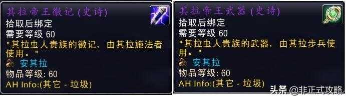 随后解锁的40人团安其拉神殿的掉落也成为玩家们关注的重点。在这个团本掉落列表里,有两个物品引起了玩家们的好奇,它们就是【其拉帝王徽记】和【其拉帝王武器】。
