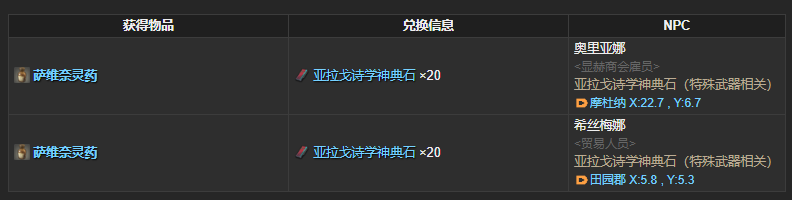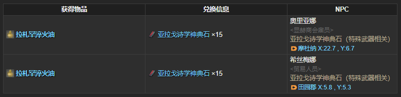 在田园郡/摩杜纳花费15诗学购买一个拉扎罕淬火油,顺路花费60诗学购买3个萨维奈灵药。这两个东西在你最开始缴纳绿装武器以后制作出来胚子以后,打完本一条龙以后需要用到,为了避免来回乱跑可以提前先买好。