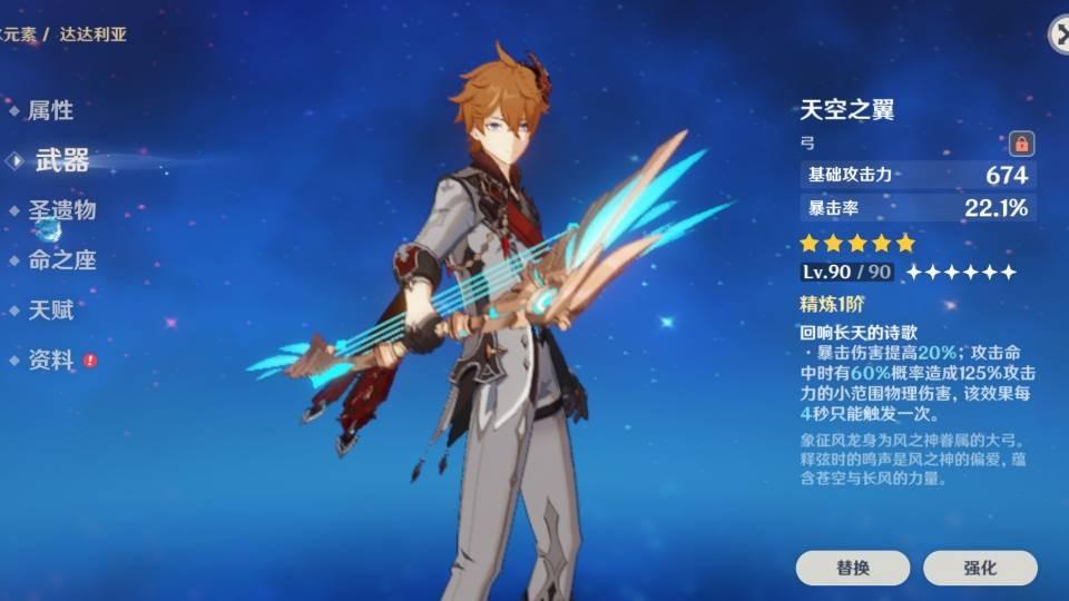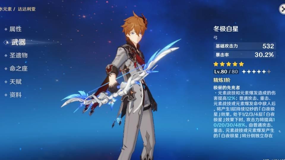 其次可以选择的五星也非常多,基本上在你还没有抽到冬极白星之前,所有的五星弓对于公子来说都是过渡或是部分契合,像是飞雷之弦振主属性提供珍贵的暴伤加成之外,公子装备上后的效果是主要提升普攻的伤害输出,因此也适合喜欢打普攻流的公子,另外阿莫斯之弓则是在被动效果方面对于公子来说比较不是那么适配,但本身的基础攻击力白值跟主属性还算可用,至于天空之翼则是提供暴率加成的主属性,但也和冬极白星差了10%的暴击率,同时这把弓算是比较容易获取的五星弓,因此在冬极白星尚未出来前,天空之翼可以同时提升暴率和被动提升暴伤的效果来说,也是非常适合公子的五星武器。