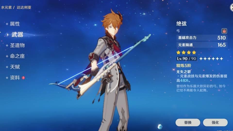 四星武器的部分,首要推荐满精炼的弓藏,可以增加普攻伤害80%,满精弓藏甚至可以超越一些非冬极白星的精炼1五星弓。在新手神瞳尚未搜集完毕时,体力条是弥足珍贵的,弓藏利好普攻,不耗体就能打出漂亮伤害,并有大量攻击区加成,对新手非常友好,站着A,配合闪避就行。但重击是公子后期追DPS重要的手法,这把弓却有重击的debuff,并且公子突破为水伤,双爆不好撑也是它拿起来不舒服的地方。