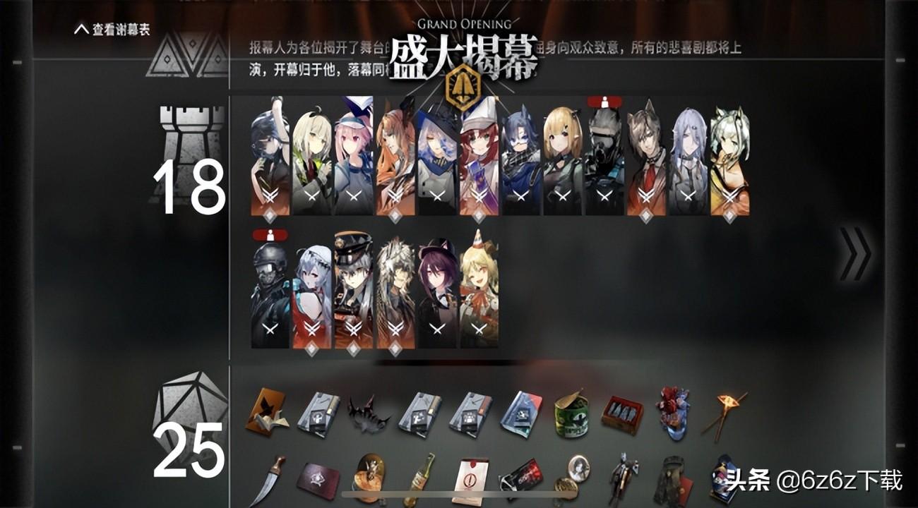 元老六星,六星中衣着是罗德岛工作服的,例如凯尔希、煌、迷迭香、亚叶。