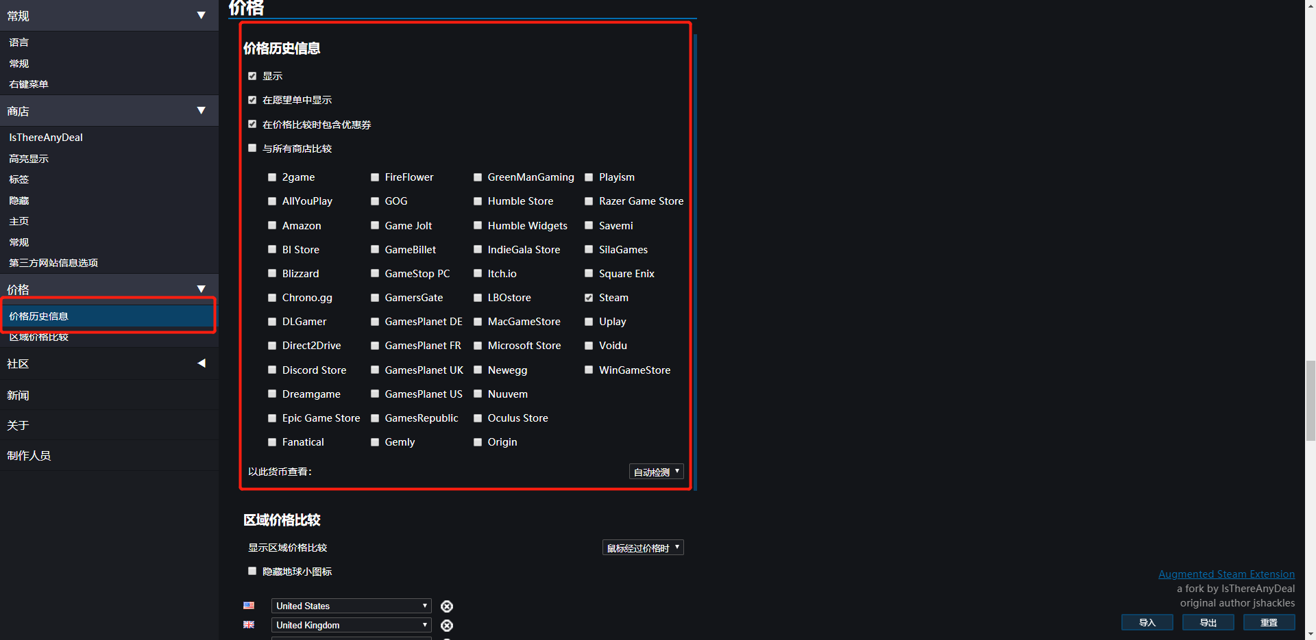 Augmented Steam是一款很强大的steam比价插件,功能非常多,这里省钱君就不所有都拎出来介绍了,仅详细介绍几个最实用的功能: