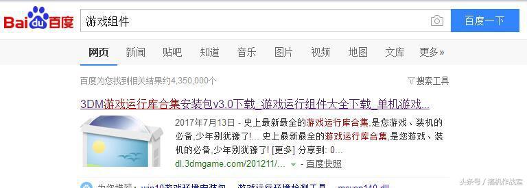 1、打开浏览器,直接搜索关键词“游戏组件”,然后点击第一个搜索“3DM游戏运行库合集安装包下载”