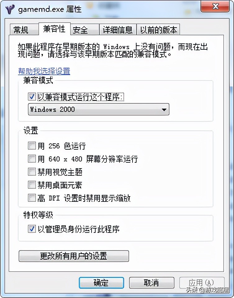 2.兼容性設置 一般单机 Game.exe (原版) 、GameMD.exe(尤里复仇) 设置为WIN2000兼容,其他平台改了别的游戏程序名字的话,找到它,继续win2000即可。