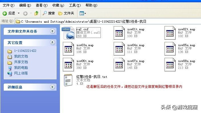 红警任务是游戏红色警戒的一种游戏模式。红警有2种游戏模式,一是遭遇战模式,另一种是任务模式。而一款精心制作的任务,可以给游戏者发挥自己聪明的空间和指挥大军的爽快感。但很多新手朋友对任务的安装方法有困惑,这里给大家大概说明一下红色警戒2(含尤里的复仇及共和国之辉)任务的安装及游戏方法。这里以“红警2任务-抗日(7关)”为例,演示该任务的安装方法,尤里的复仇及共和国之辉任务的安装方法与此相同,该任务下载地址是:留言后贴出。第1步:你在红警之家下载的任务大多是RAR压缩包的形式,所以需要先解压。(图一)