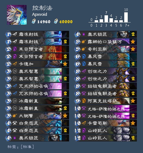 这套牌的雏形来自狗哥在拉斯维加斯夺冠的冰法(预构筑也是狗哥提出的)。由于现在法师形态众多,这种类型的盒子法普遍被称为控制法。这套控制法来自美服著名法神——Apxvoid的构筑。