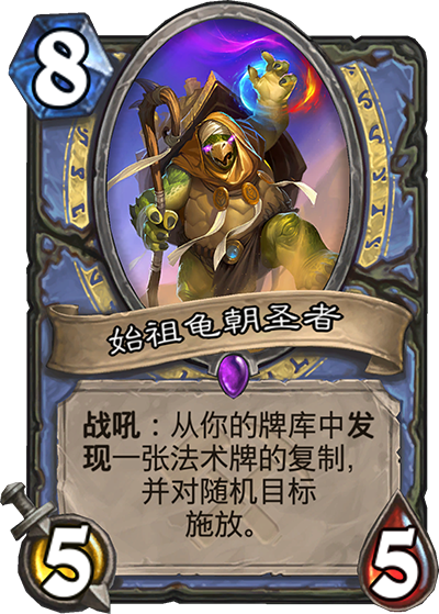 另外始祖龟朝圣者作为新版本的单卡远远超出了玩家对他的预期,这个版本法师的强力法术让这张牌的价值得以体现,而且始祖龟朝圣者的战吼效果是复制牌库中的法术,打出以后牌库中的法术依然存在,这张牌提供给了法师额外的质量,额外的创世之力、谜之匣和咒术师的召唤都是非常强力的,值得注意的是,始祖龟朝圣者在施放咒术师的召唤的时候还会给法师一张非双生的咒术师召唤,咒术师召唤开始祖龟朝圣者出佛丁的情况也是屡见不鲜。