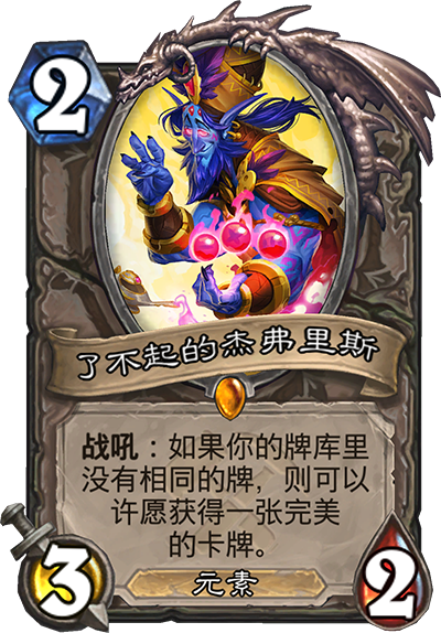 了不起的杰弗里斯在宇宙卡组中的表现非常突出,这张卡确实是完美的卡牌,不管是绝境翻盘、顺境斩杀还是均势的时候找资源,杰弗里斯都非常不错。甚至杰弗里斯可以在2费找到德鲁伊的职业卡——野性成长,在3费打出后后一回合就可以提前开银河,打出宇宙法的上限。