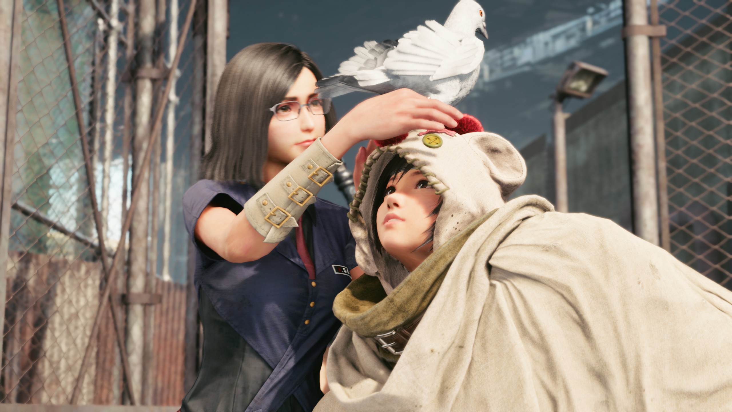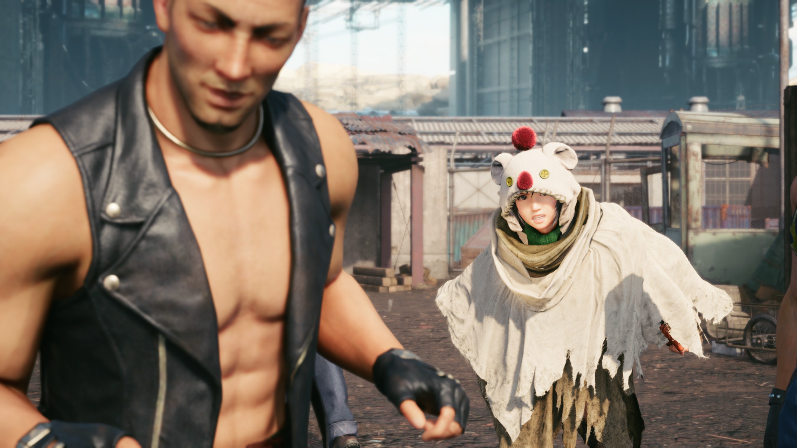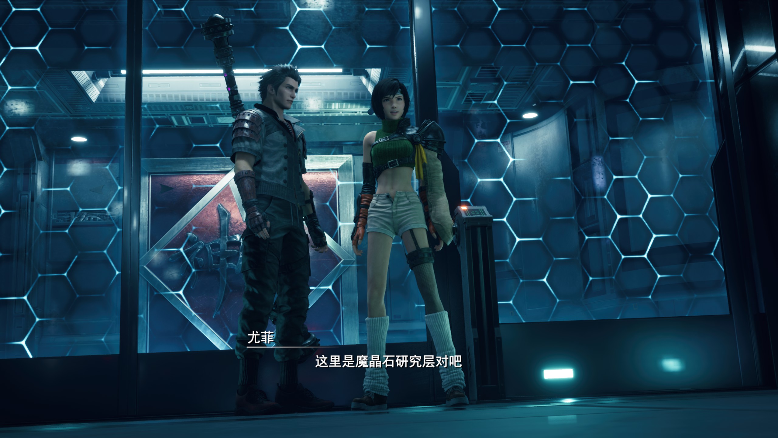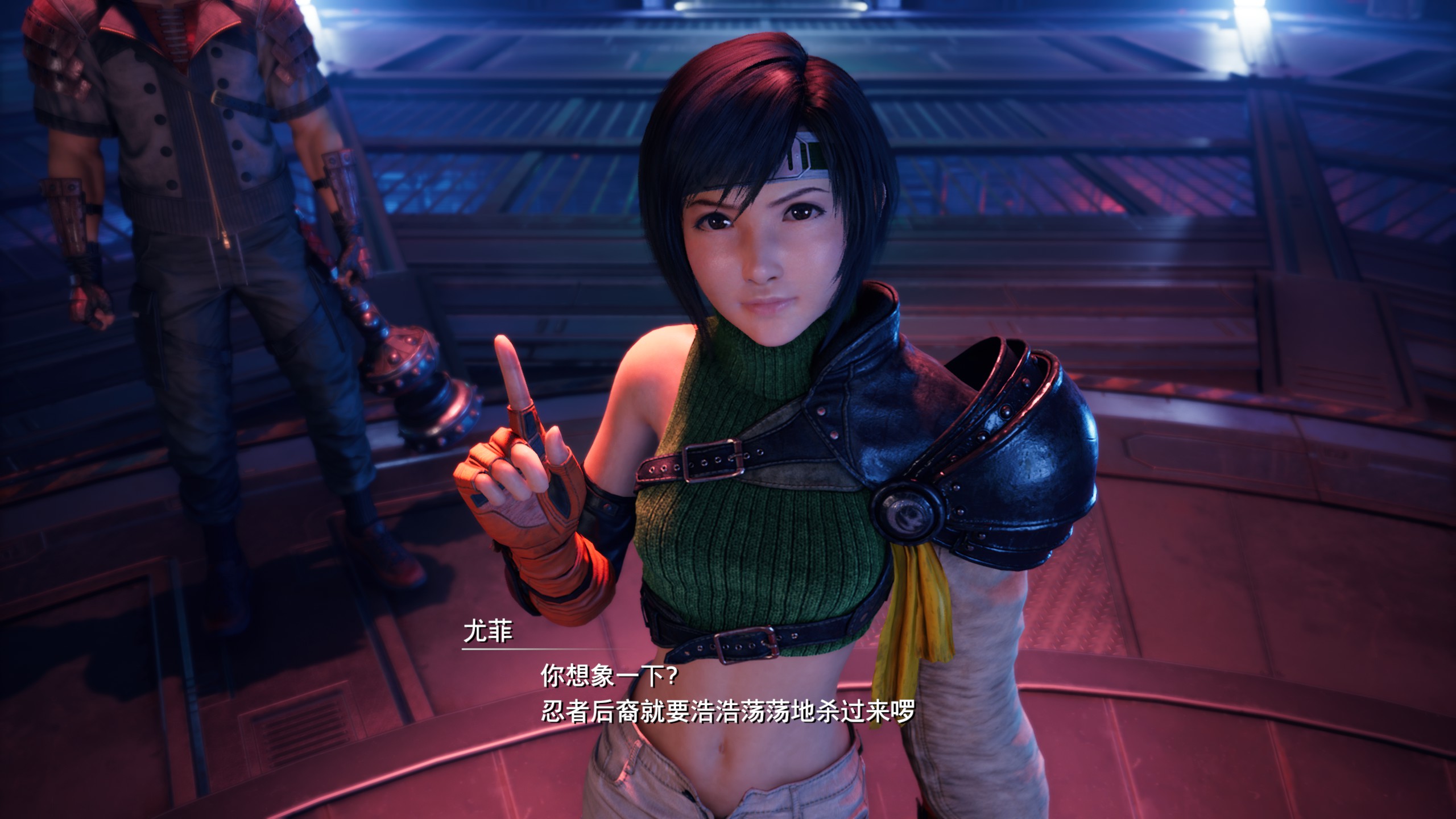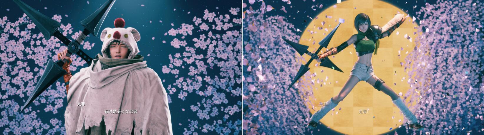 重制版则有两个造型:第一章中行走的人形莫古力(误)、还有第一章BOSS战结束时的美少女变身:绿色高领毛衣+左手的忍具护臂+没扣扣子的热裤(强迫症患者噩梦)+单腿丝袜——总体而言,虽然我个人不是太喜欢那个绿色高领毛衣,但对比原版而言,在尤菲身上所体现出来的图像技术进步是非常明显的,装束上也更多了一分热力与性感。