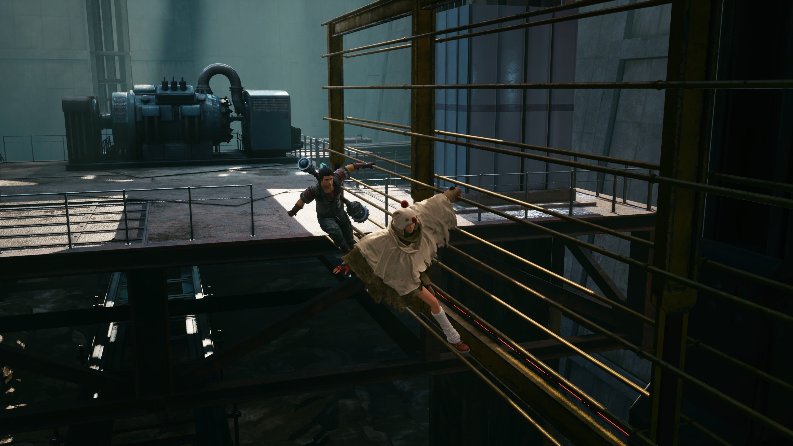 而作为“忍者”,尤菲与萨隆的机动性也比主角团队高了很多,比如这种护栏就可以实现铁驭一般的“飞檐走壁”,在第一章的修理厂中就充分展现了这种护栏与开启机关之间的一些组合乐趣,此外更多的“电梯”类设置也让地图也更具有纵深。